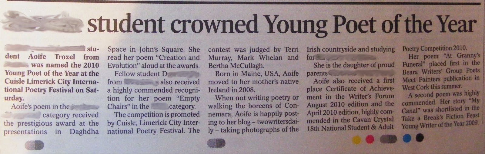 Can you read that? It says: Cuisle Young Poet of the Year 2010. Young. Poet. Of. The. Year. That is correct, I won the top award in the competition, not my age category. Out of all the poets aged under eighteen, I won overall.